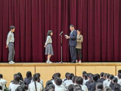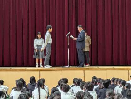 昨日の全校集会の際に行われた表彰の様子です。10月26日(土)から28日(月)にかけて行われた全国パラスポーツ大会(SAGA2024)に2名の生徒が参加し、すばらしい成績を収めました。おめでとうございます。