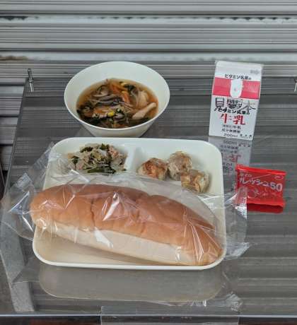 焼きシューマイ 中華みそスープ ツナと野菜のオイスターソースいため コッペパン 牛乳 いちごジャム