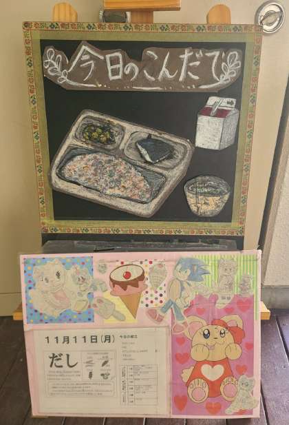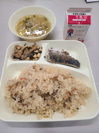 さごしのごまじょうゆかけ すまし汁 大豆の煮もの かやくご飯 牛乳