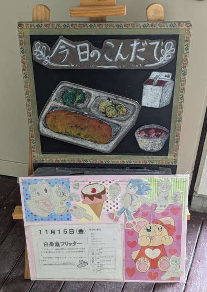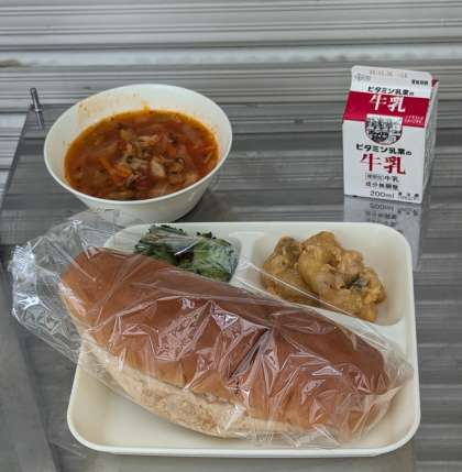 白身魚フリッター ミネストローネ ブロッコリーのサラダ 黒糖パン 牛乳
