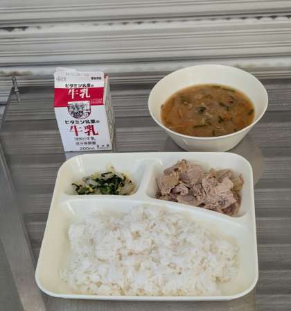 豚肉のしょうが焼き さつまいものみそ汁 きくなとはくさいのごまあえ ごはん 牛乳