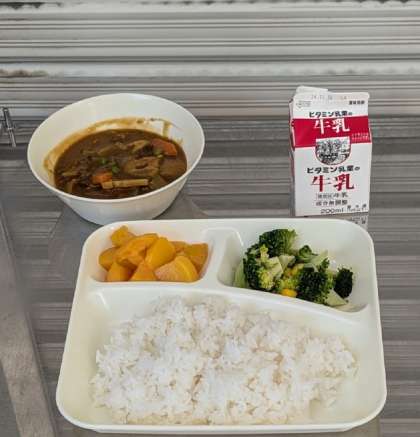 冬野菜のカレーライス ブロッコリーとコーンのサラダ 黄桃(カット缶) ごはん 牛乳