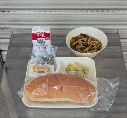 カレーうどん はくさいのおひたし ミニフィッシュ コッペパン 牛乳 マーマレード