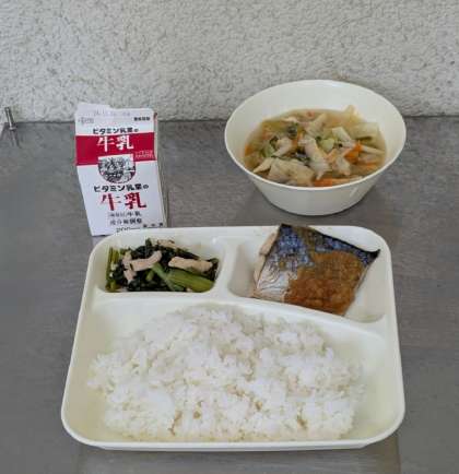 さばのおろしじょうゆかけ 五目汁 こまつなの煮びたし ごはん 牛乳
