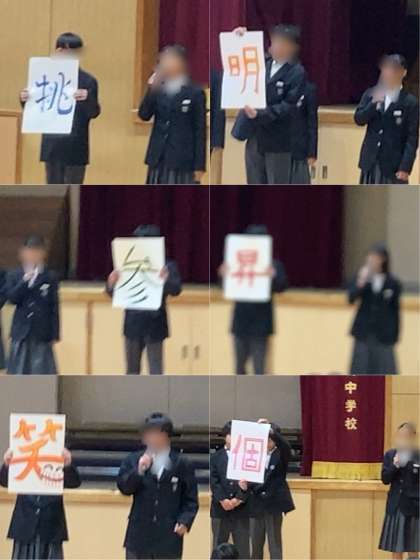 昨日の1年生の学年集会の様子です。2学期を振り返るとともに、3学期に向けての目標も含めて、学級代表が各クラスを漢字1字で表し、発表してくれました。それぞれのクラスのカラーが反映された、とてもすばらしい発表となりました。