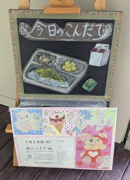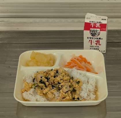 親子丼 紅白なます まっ茶大豆 洋なし(カット缶) ごはん 牛乳