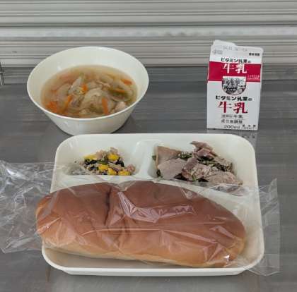 ツナとチンゲンサイのいためもの 黒糖パン 牛乳