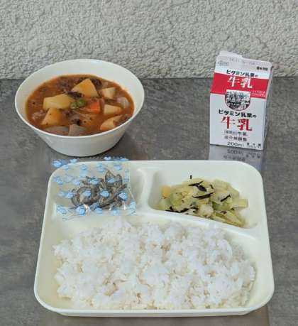 ハヤシライス キャベツのひじきドレッシング ミニフィッシュ ごはん 牛乳