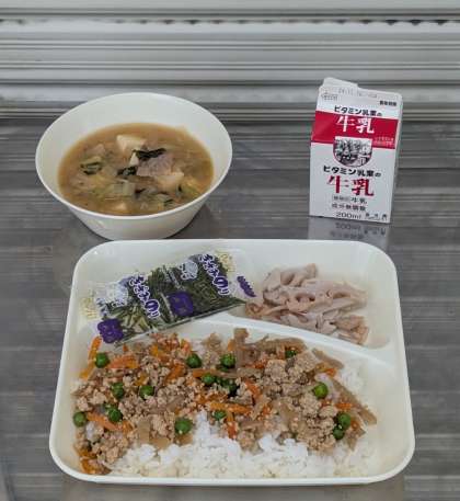 鶏ごぼうご飯 きざみのり みそ汁 焼きれんこん ごはん 牛乳