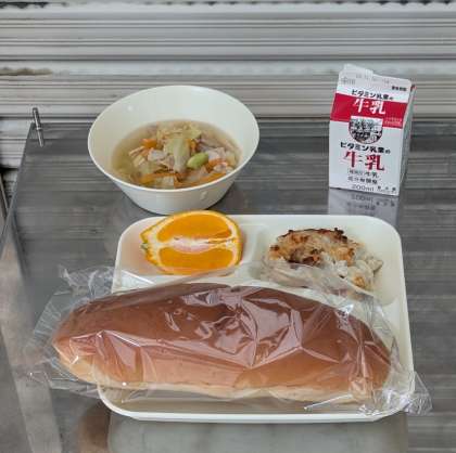 押麦のグラタン スープ デコポン 黒糖パン 牛乳