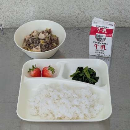 すき焼き煮 ほうれんそうのおひたし いちご ごはん 牛乳