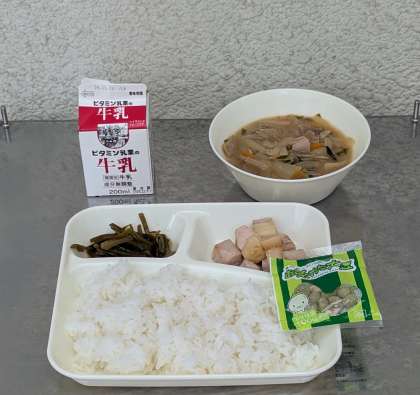 まぐろの甘辛焼き 豚汁 くきわかめのつくだ煮 まっ茶大豆 ごはん 牛乳