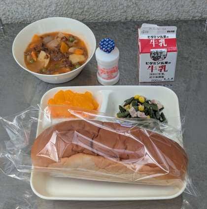 ビーフシチュー ベーコンとさんどまめのソテー みかん(缶) 発酵乳 黒糖パン 牛乳