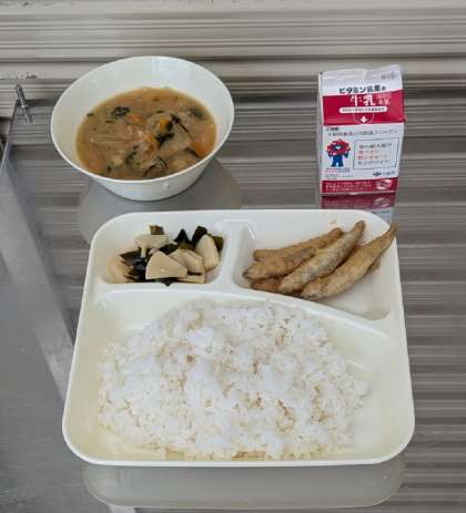 きびなごてんぷら みそ汁 わかたけ煮 ごはん 牛乳