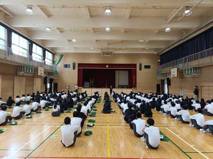 3年生は学年集会で、修学旅行に持っていくもの、それぞれの行程で必要なものなど、しおりを使って読み合わせをして、内容を確認していました。