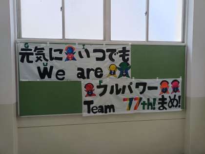 階段踊り場の掲示板に掲げられています。修学旅行に向けてフルバワーでがんばれ3年生!