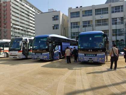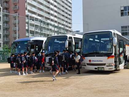 荷物を今日の体験別にバスにのせて、自分のクラス別に乗車します。