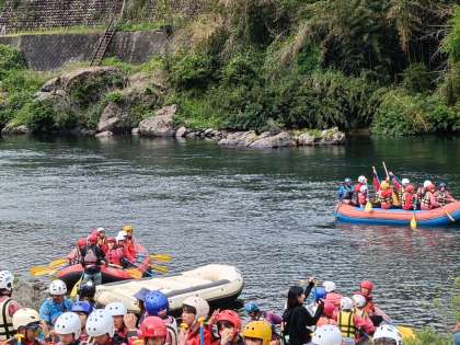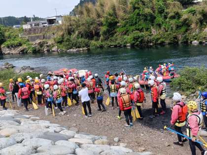 バスでの移動中にインストラクターからの説明があり、出発地点ではライフジャケットがしっかりとしまっているか確認があり、パドルを持ってボートに乗りこみます。