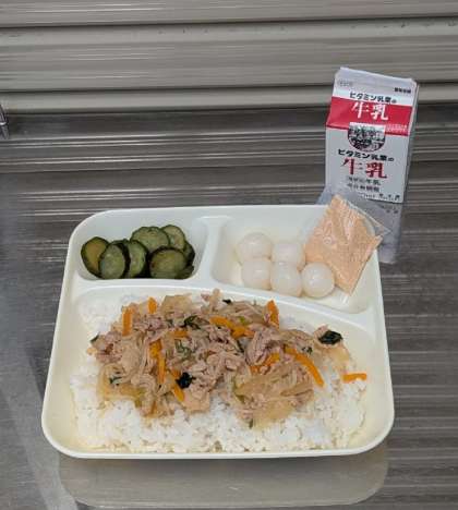 豚丼 きゅうりのかつお梅風味 白玉だんご きな粉 ごはん 牛乳