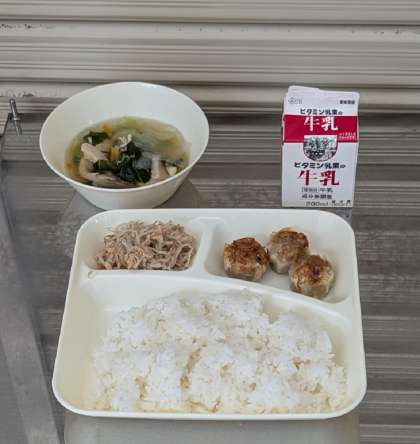 焼きシューマイ 鶏肉とはるさめのスープ ツナともやしのいためもの ごはん 牛乳