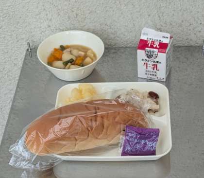 金時豆の中華おこわ まる天と野菜のうま煮 パインアップル(カット缶) コッペパン 牛乳 ブルーベリージャム