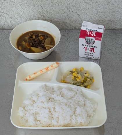 牛肉と大豆のカレーライス レタスとコーンのサラダ 棒チーズ 牛乳