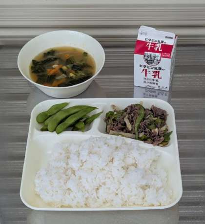 チンジャオニューロウスー 中華みそスープ えだまめ ごはん 牛乳