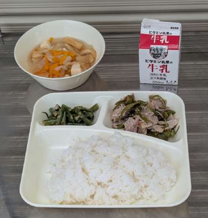 豚肉の梅風味焼き 五目汁 さんどまめのごまあえ ごはん 牛乳