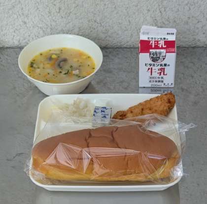 サーモンフライ 豆乳スープ キャベツのゆずドレッシング 固形チーズ パンプキンパン 牛乳