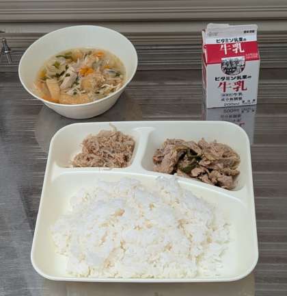 豚肉のごまみそ焼き 五目汁 ツナともやしのいためもの ごはん 牛乳