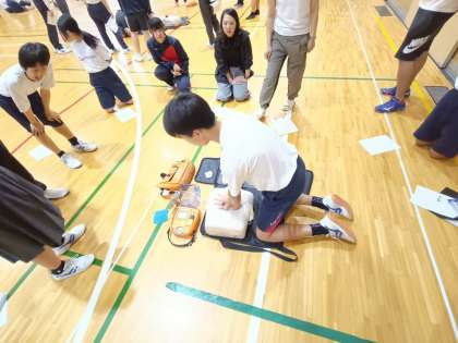 なかなか心肺蘇生法は難しいですね。みんな力を入れて実習しています。よい経験ができました。命の大切さを改めて学びました。