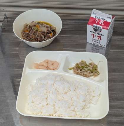 牛丼 もやしとピーマンのごまいため 大福豆の煮もの ごはん 牛乳
