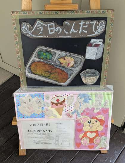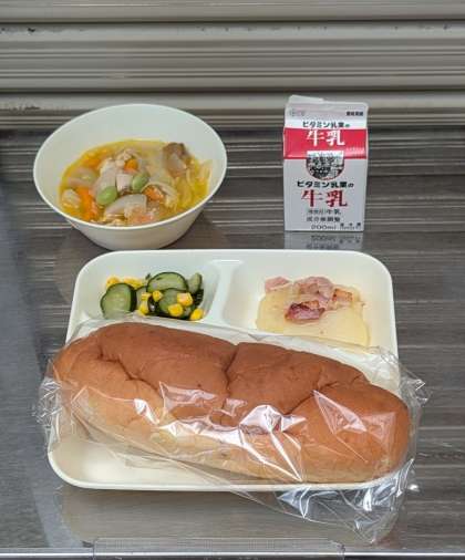 鶏肉と野菜のスープ煮 ジャーマンポテト きゅうりとコーンのサラダ おさつパン 牛乳