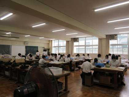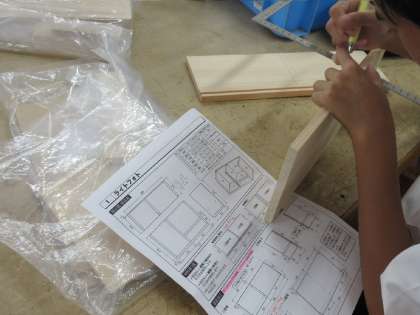 こんなに暑いのですが、技術室は冷房がありません。そのような中、木製のラックを作成していました。差し金を使用し線を引いていきます。上手くできたかな。