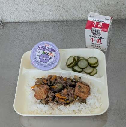 マーボーあつあげ丼 きゅうりの中華あえ ぶどうゼリー ごはん 牛乳