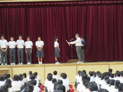 また、始業式の日に引き続き、水泳部は近畿大会や大阪府大会も含めて、男女のバスケットボール部はオールスターに選考された選手に対して伝達表彰を行いました。今後も頑張ってくださいね。