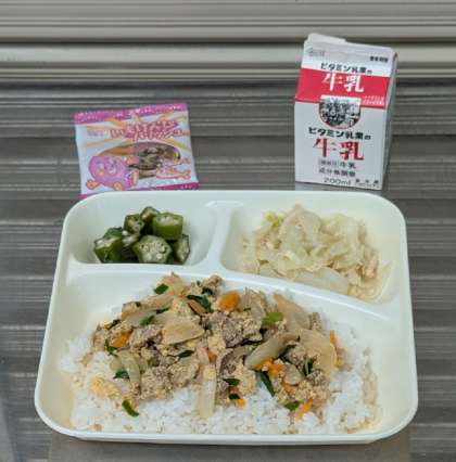 他人丼 ささみとキャベツのいためもの オクラの甘酢あえ