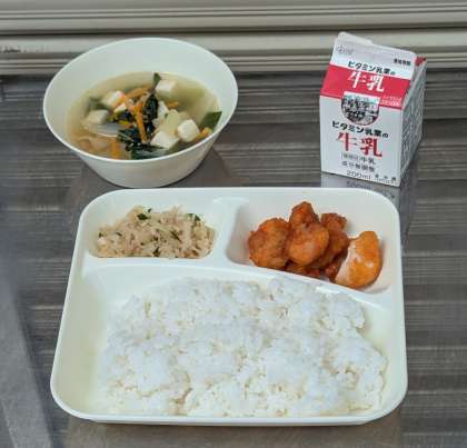 ヤンニョムチキン とうふのスープ 切干しだいこんのナムル ごはん 牛乳
