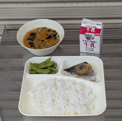 さごしのみぞれかけ かぼちゃのみそ汁 えだまめ ごはん 牛乳