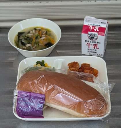 まぐろのオーロラ煮 スープ さんどまめとコーンのサラダ コッペパン 牛乳 ブルーベリージャム