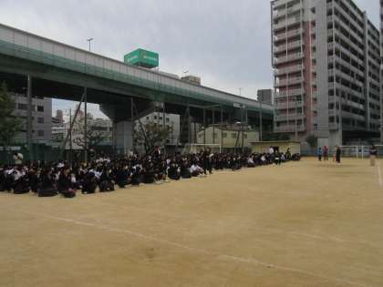 グラウンドに各学級で整列後、地域別の班に整列しなおしました。