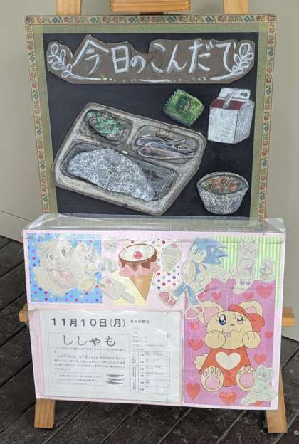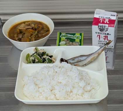焼きししゃも 和風カレー汁 ささみとこまつなのいためもの