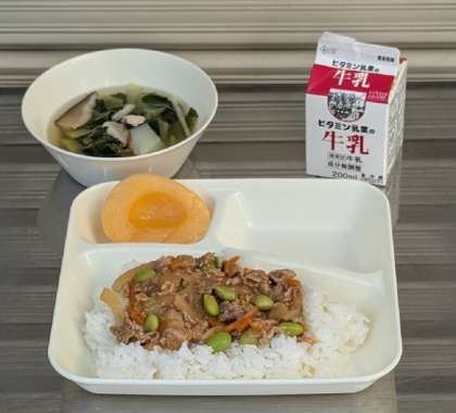 ピリ辛丼 中華スープ 白桃(カット缶) 牛乳