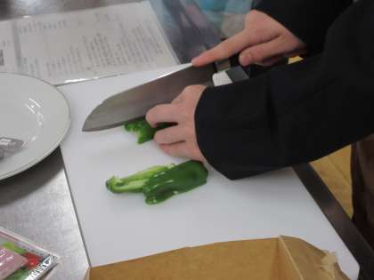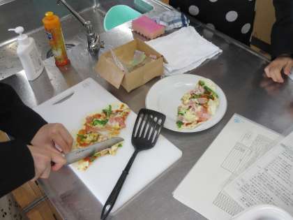内容は調理実習で、餃子の皮を使ってパリパリピザを作りました。
