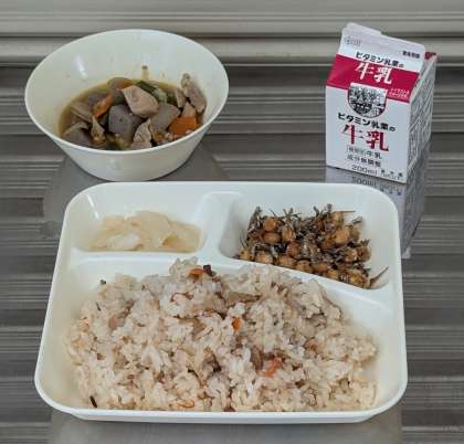 鶏肉と野菜の煮もの じゃこ豆 かぶのゆず風味 かやくご飯 牛乳