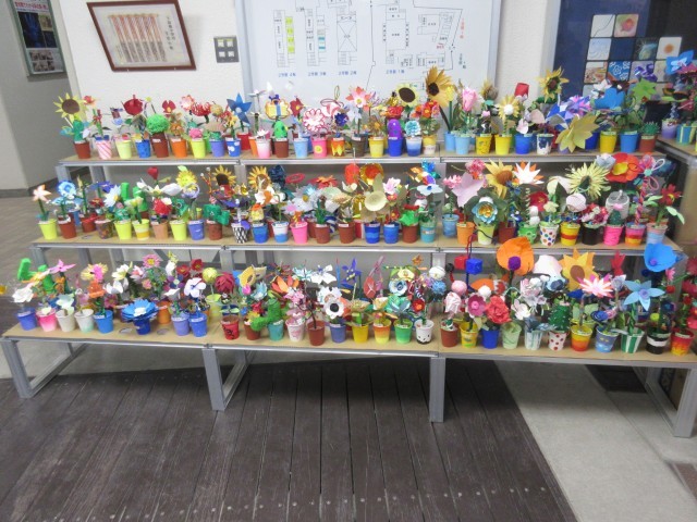画用紙や和紙、針金、モール、毛糸、紐、ビニールテープなどあらゆる材料から自分の思う花の完成を目指して作成しました。