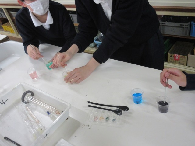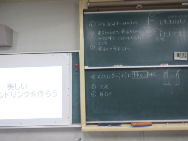 さまざまな色の美しいドリンクを作ろう。食紅を混ぜてきれいな色を作っていました。