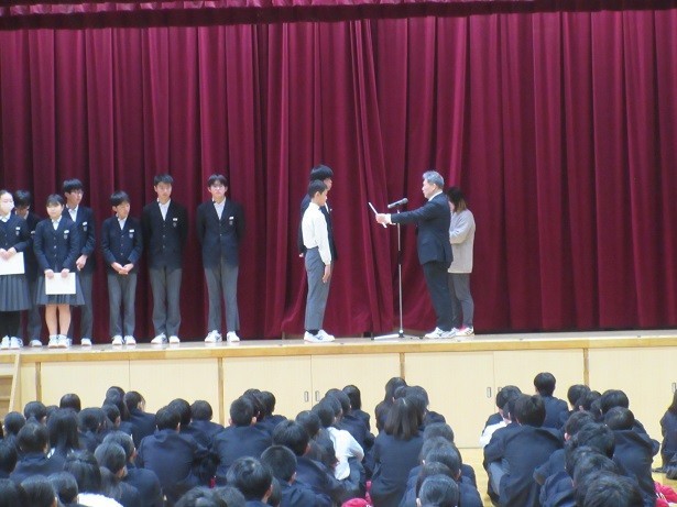 また、伝達表彰は、昨日まで、江之子島文化芸術創造センターで開催されていました大阪市立中学校造形展に出品された代表生徒への表彰と男子ソフトテニス部の表彰がありました。