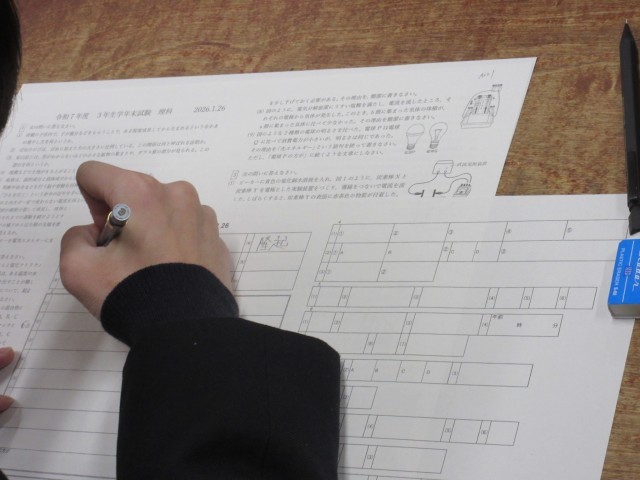 中学校生活最後の定期テストですね。私学の入試も近いことから、一段と集中して試験を受けているように見えます。最後までがんばってください。