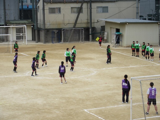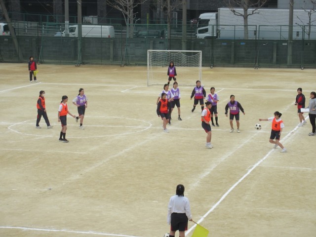 女子はグラウンドでサッカーです。